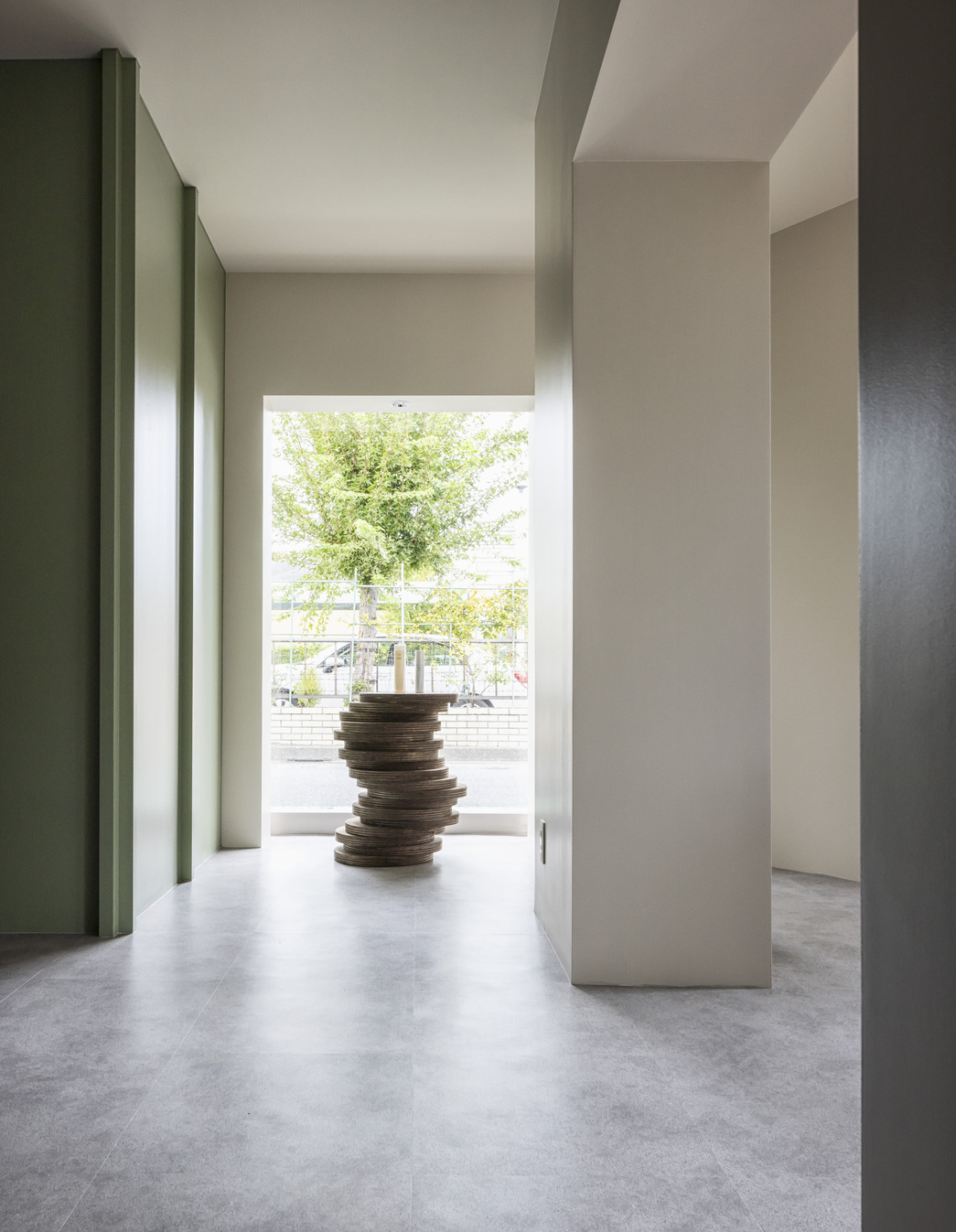 お子様がお腹の中にいる時に呼んでいた“まる”。子供も0歳、経営者としても0歳という思いから店名も”maru”と名付けた。敢えて荒々しい丸いベニヤ板を積層し、成長過程というメッセージを込めたインテリアと、くぐり抜けて成長するという意味合いが込められた複数のゲートで、施術スペースを囲うレイアウトとなっている。