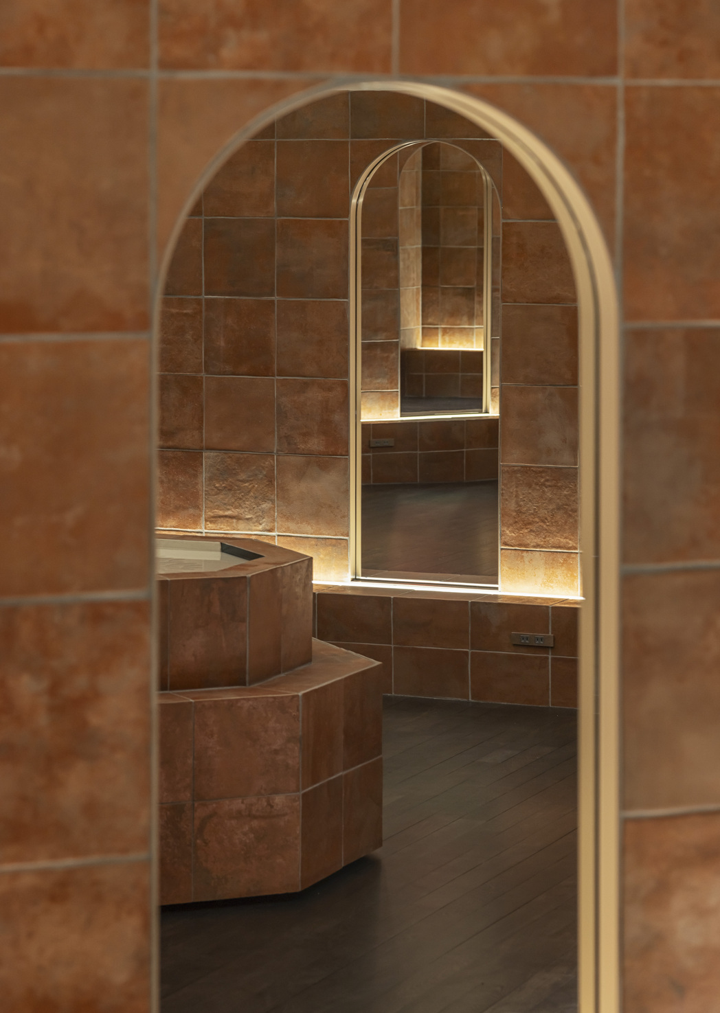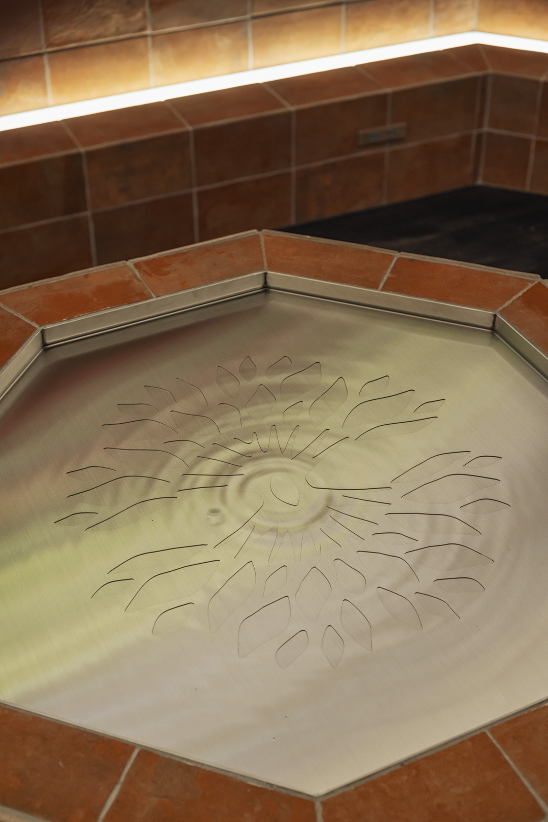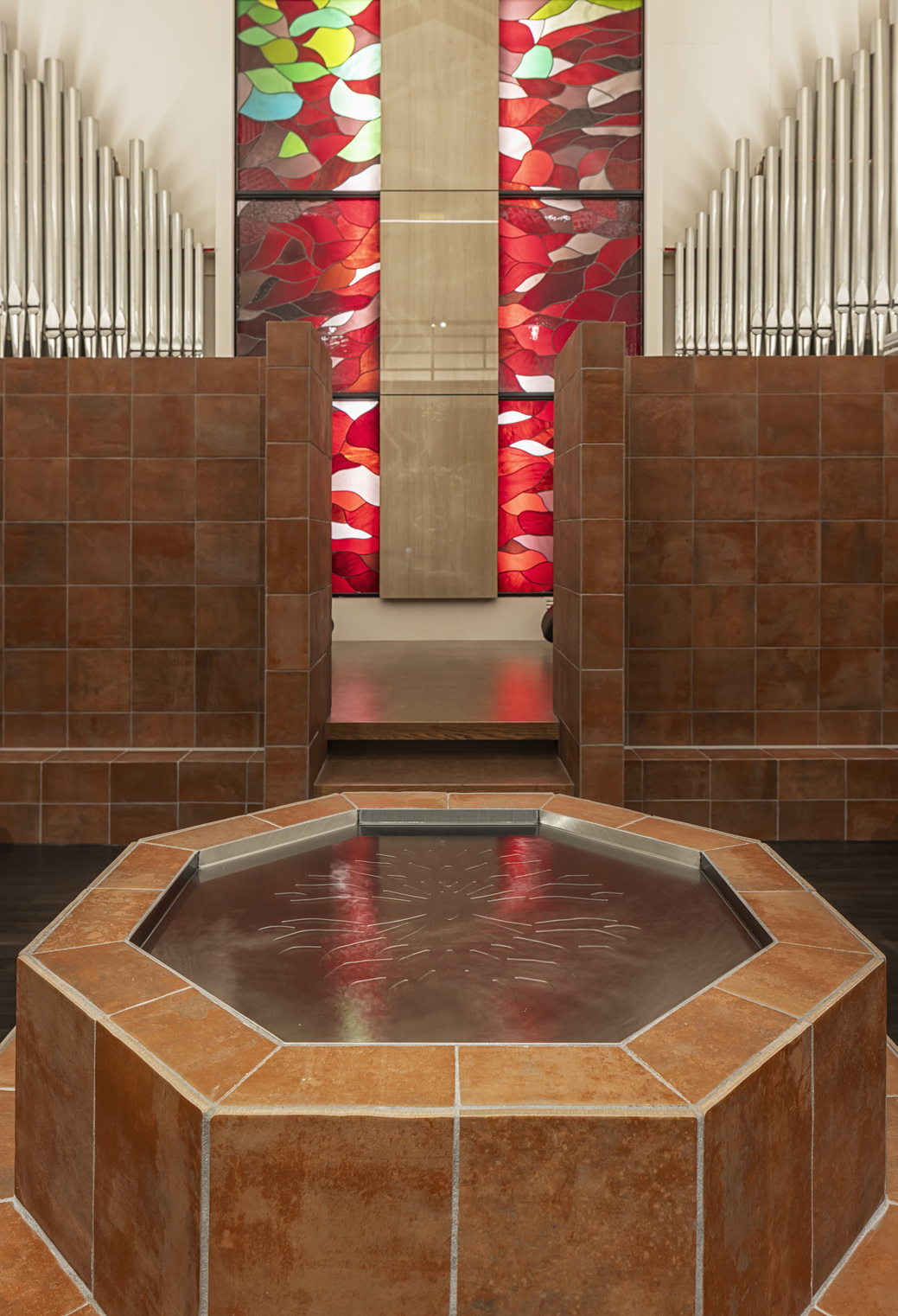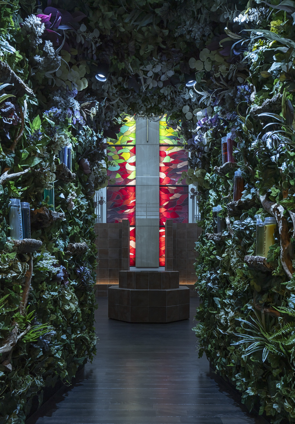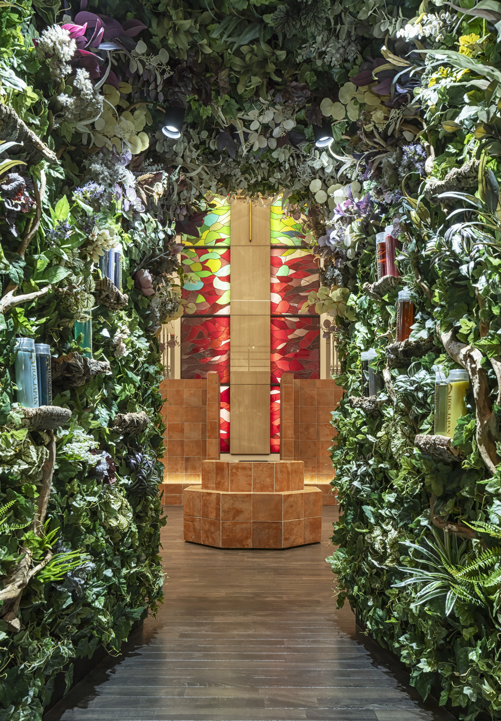 3店舗目となる本計画は、「新しい枝葉」を伸ばしていくための幹となる店を目指していた。キリスト教の教会という特殊な場とブランドコンセプトの共存を考えた際、キリスト教で「新しい始まり」を意味する八角形を軸に計画をまとめる事に行き着いた。スタイリングスペースを上から見ると八角形になっており「新しい枝葉」への思いを込めつつ、各席の視線を交錯させないための仕組みにもなっていいる。建材としては既存のフローリングを利用しつつ、テラコッタタイルを選定。美容室の機能が空間にとって異質なものにならない様配慮した。