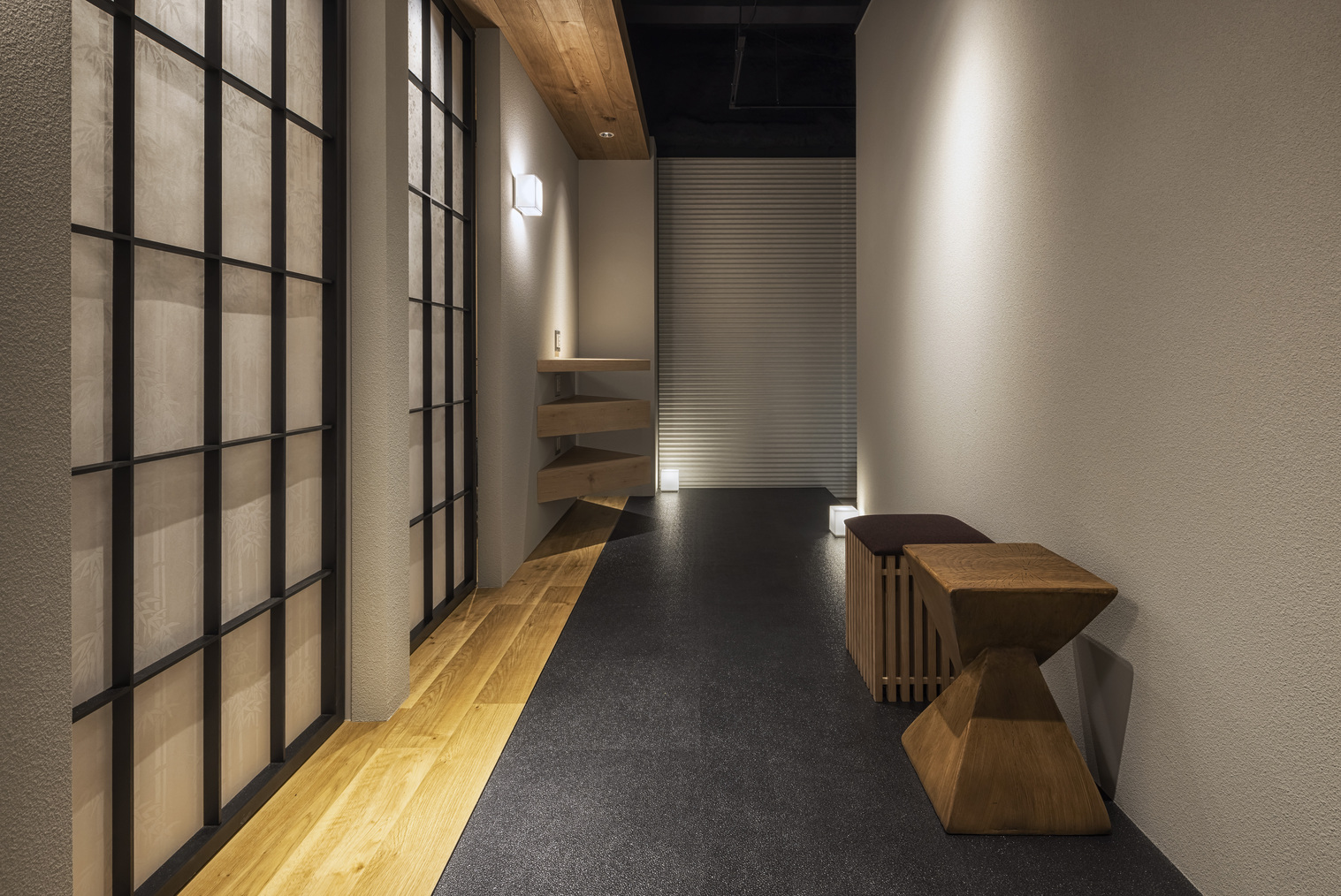 施主からの要望は、ターゲットの訪日外国人に対して、日本文化を体験できる和の空間にすることであった。そこで提案したデザインコンセプトは屋形船。通路を川に見立て、足元に照明を配し川に浮かせ灯籠流しのように演出した。また、屋形船船内の床材は畳調塩ビタイルを選択。スケルトン天井は夜空に見立てて黒く塗装した。