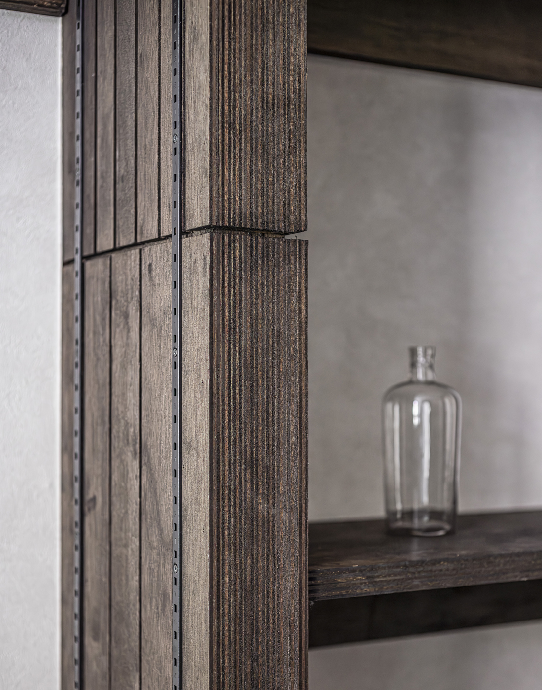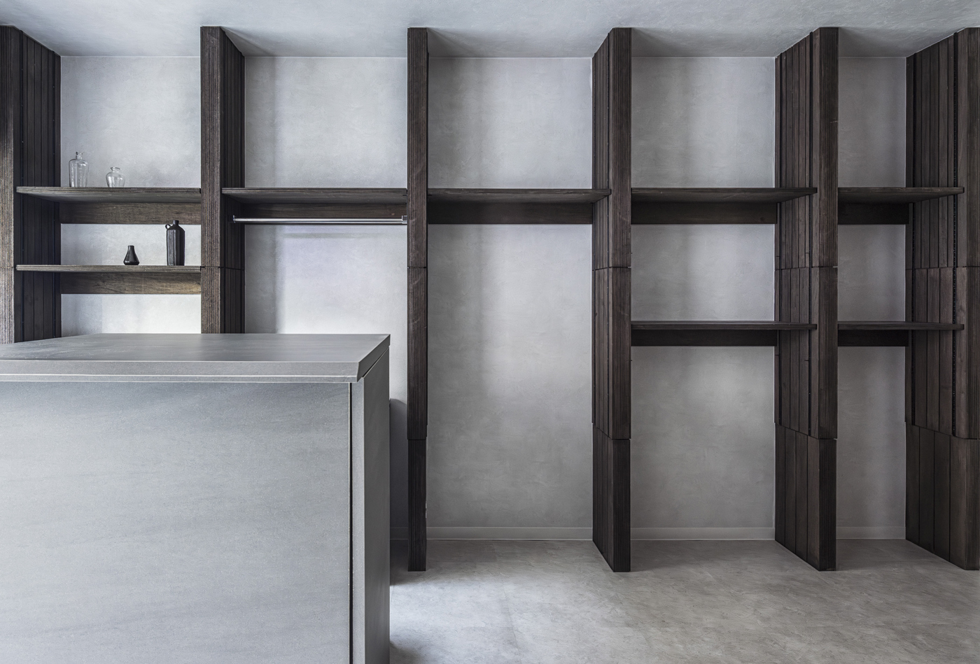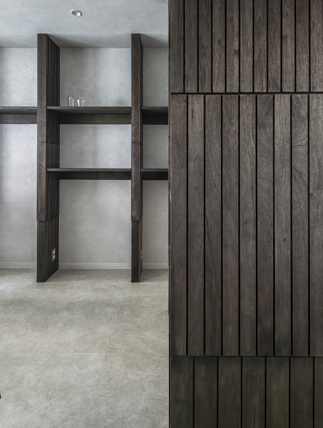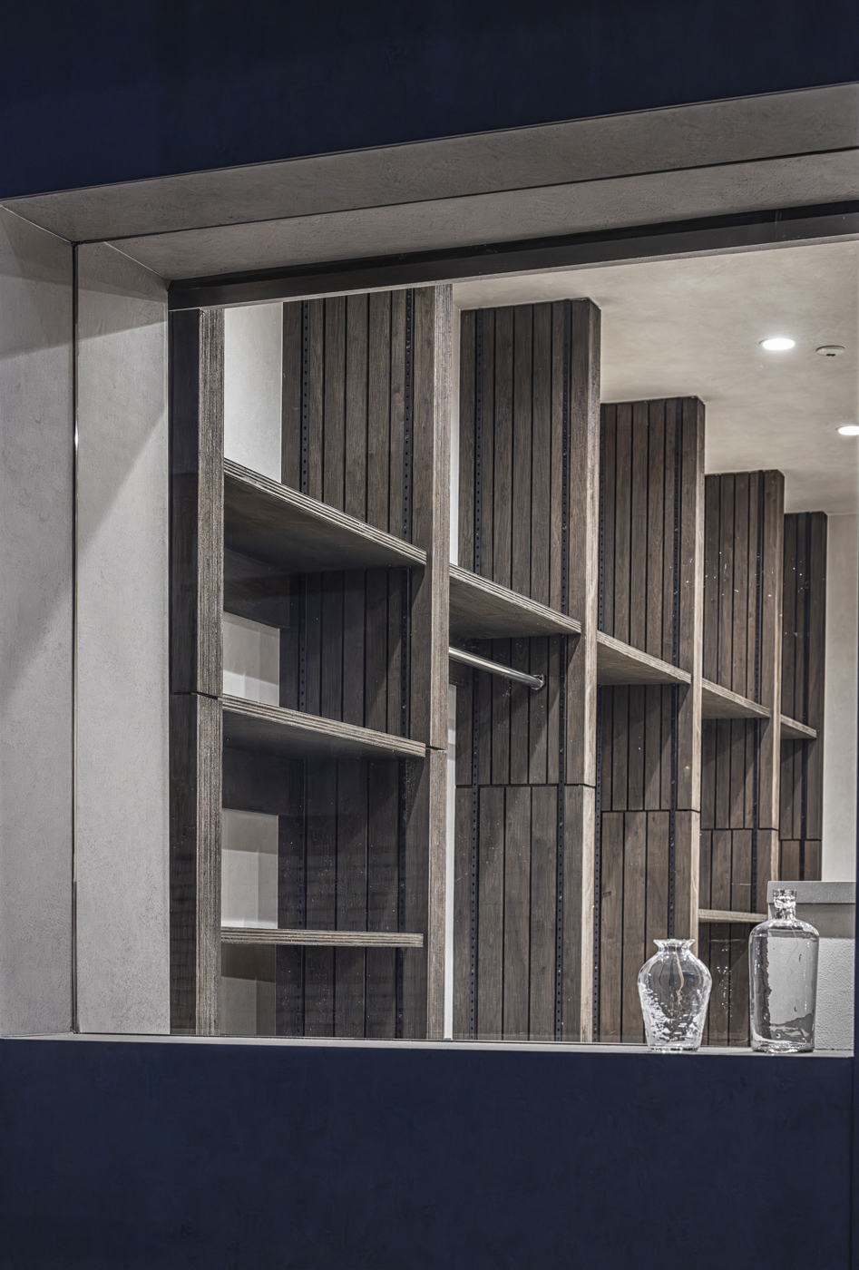 昔からあるものと新しいものの間に断絶が生まれないよう、その境界をぼんやりとさせる空間を作れないかと考えた。材料の木片っぽく合板を割いたり石切を感じさせる什器を採用したり、人の手が感じられる仕上げや古材などを用いて空間の文脈を曖昧にしようと試みた。生じる曖昧さが鏡はもちろん、これからここに運び込まれる家具や装飾品、または施主自身を親和させ、その一部となっていくことを期待している。