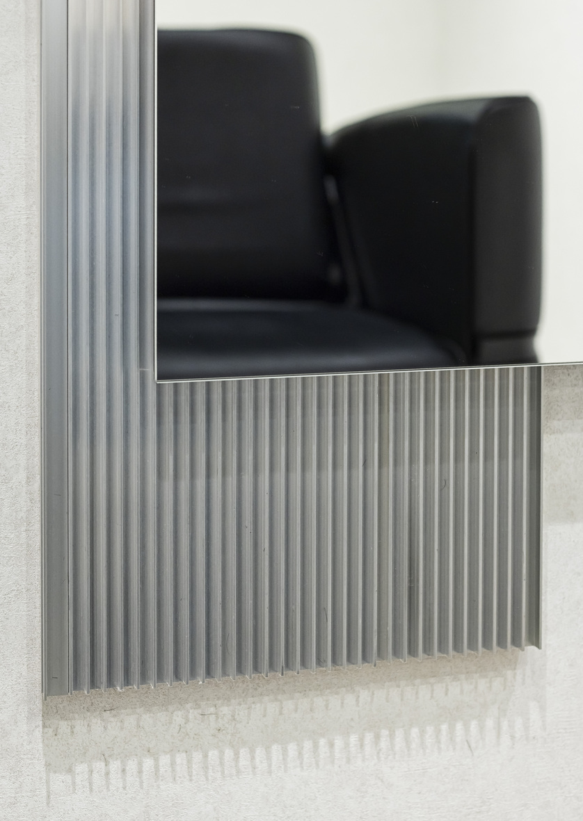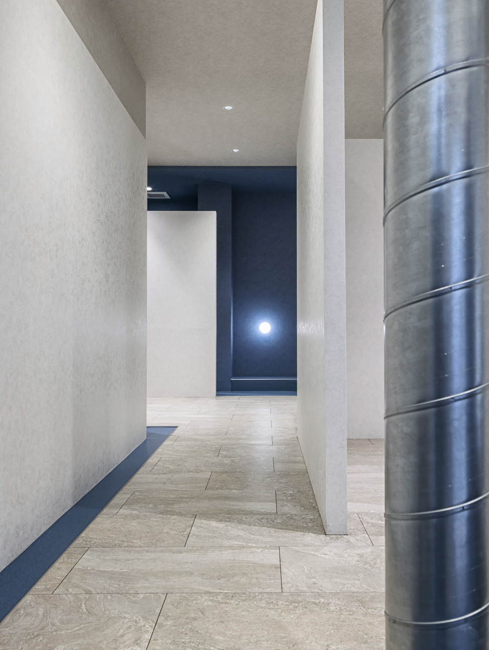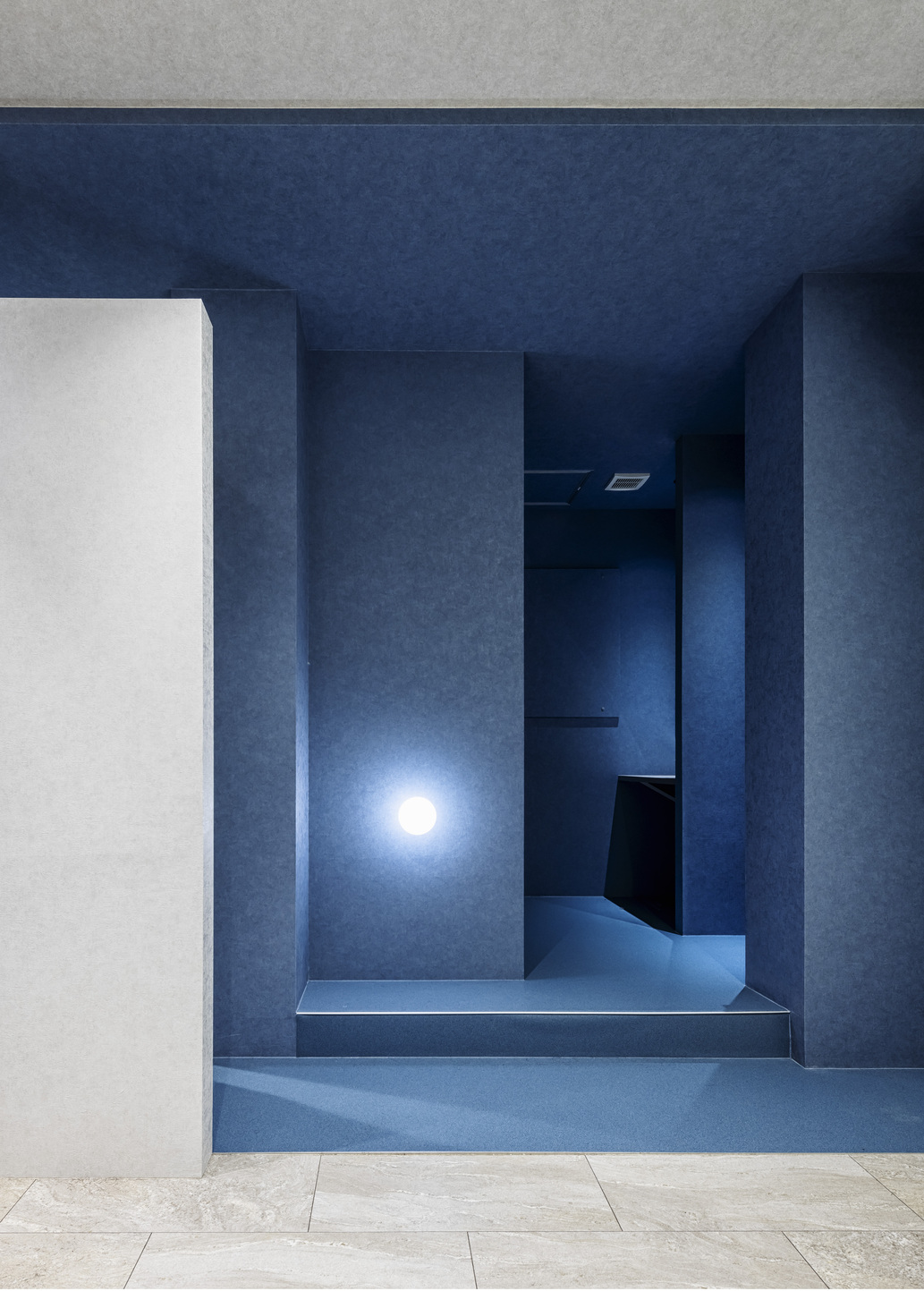 異形のテナントに対し、将来的に半個室2面になるように、また個室を作る上で狭く感じないよう、奥行きを感じるように壁を建ててレイアウトしている。極小規模の個室サロンによるミニマムな寸法構成によって、繋がりや広さ感、店のコンセプトが伝わりにくい部分を「色彩」と「素材」で解決しようと考えた。全体の色彩を街から深海へとつながるように色を選んでいる。床に水の流れのような色を使うことで繋がりを作り、奥へと視線が流れるようにしている。ミラーの下地や入口の柱・奥の光など、素材を通して何かを暗喩している。