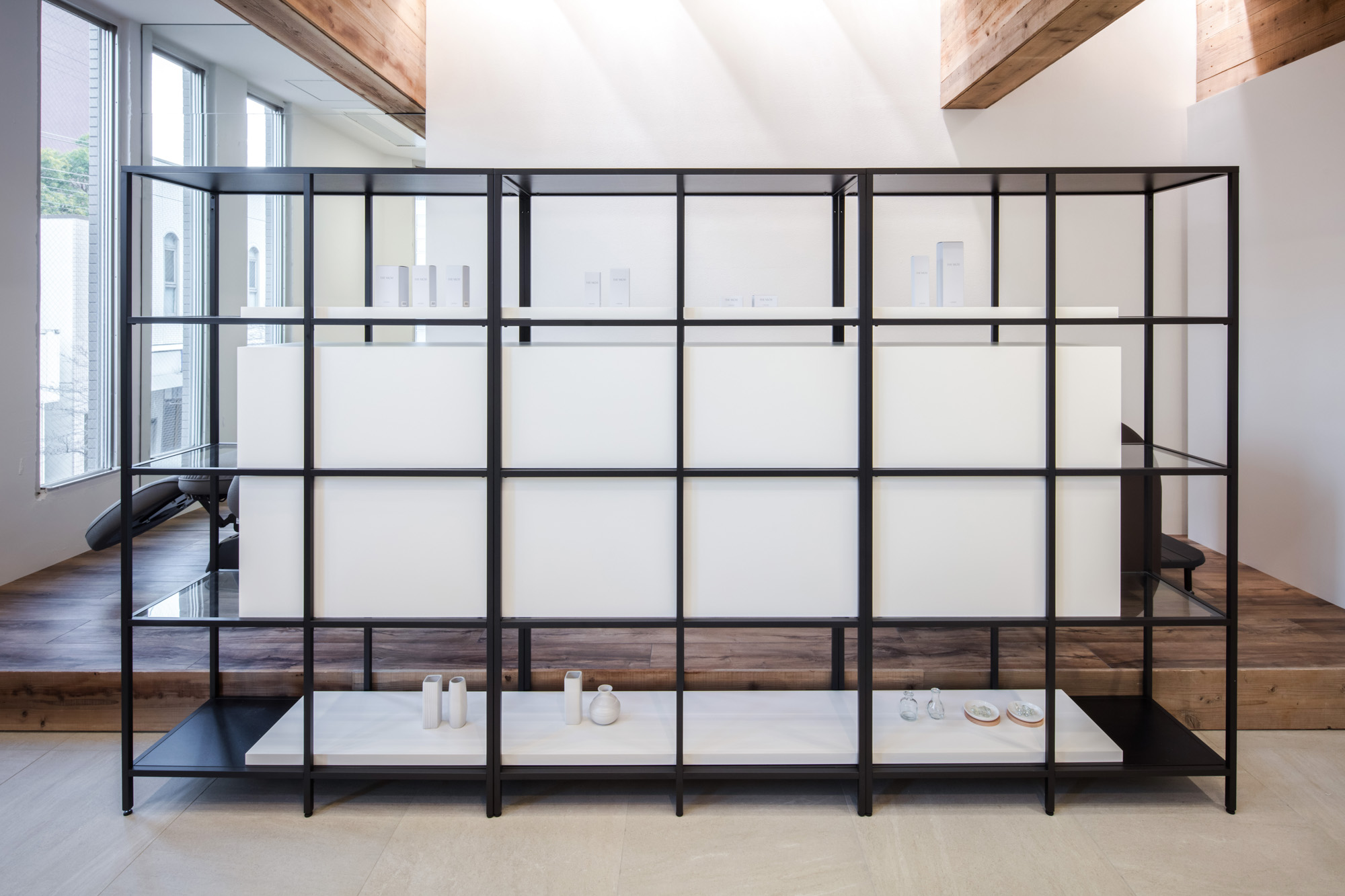 大梁の連続とスケール感によって、天井設備を隠しつつ空間の高さや奥行きを強調。箱型の空間によって、入り口すぐは幅を細く絞りアプローチを設け、箱型内部はスタイリングブースと対比的に小さなスケールのアイテムで構成。