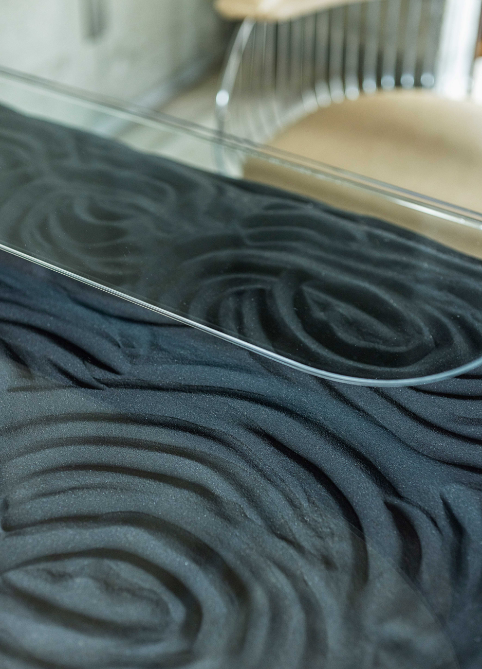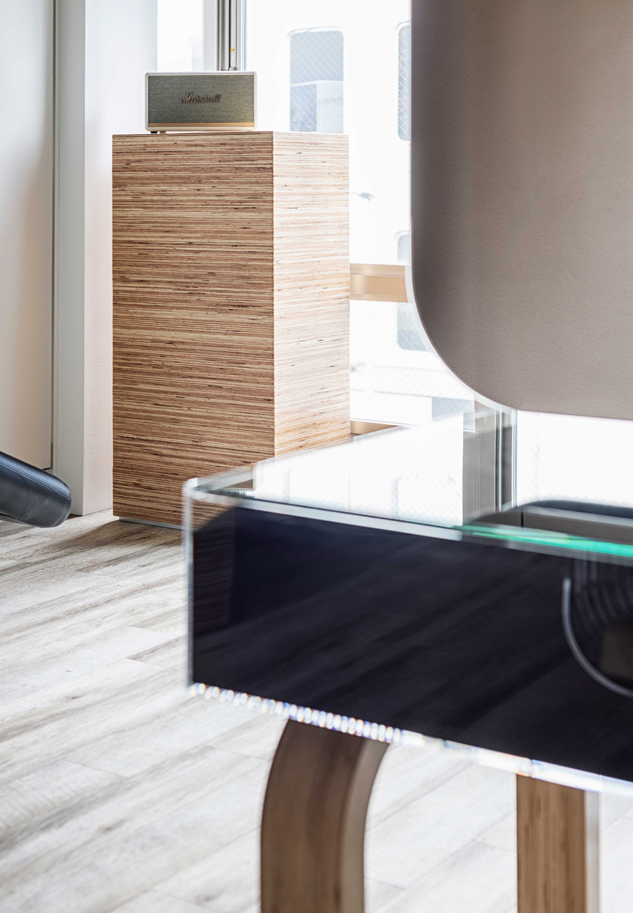 川越に開業したサロン。工業高校出身で、モノづくりの観点をベースに技術力を磨いてきたオーナー。その経験や技術力向上を武器にできる空間が求められた。経験や技術の蓄積を「aika(フィンランド語で『時間』)」と捉え、壁面や家具に積層材を選定した。砂時計から連想させた砂鉄の入った箱は、お客さまの行動に反応し、空間自体もまた時間と共に形跡を残す。