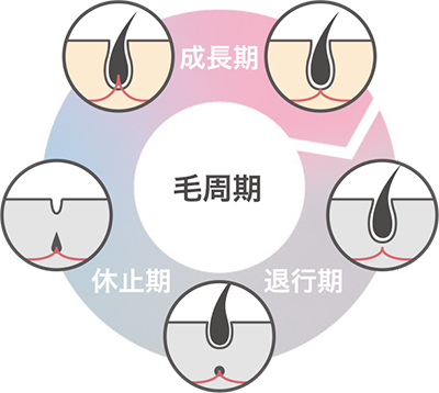 毛周期の「成長期」にあたる、メラニン色素の豊富な時期に照射することが脱毛にも効果的です。